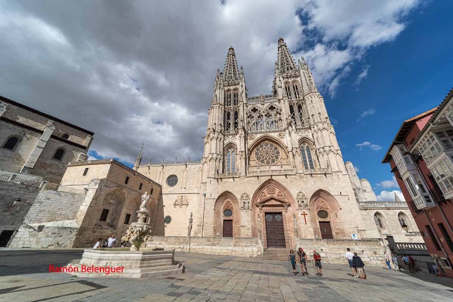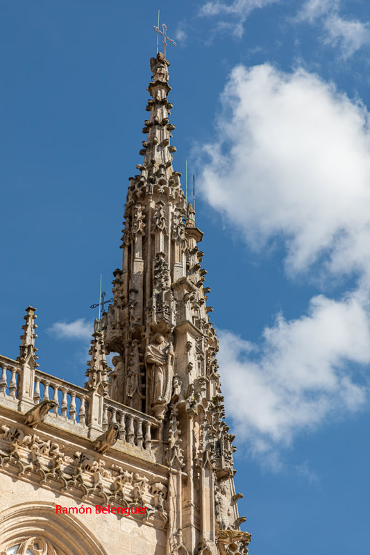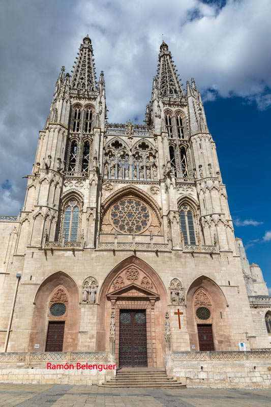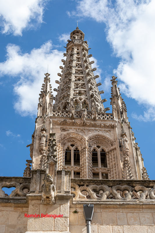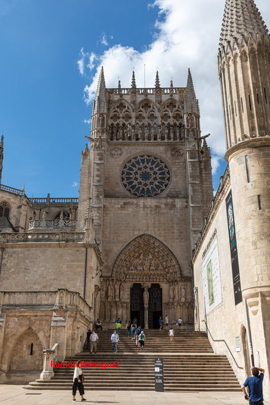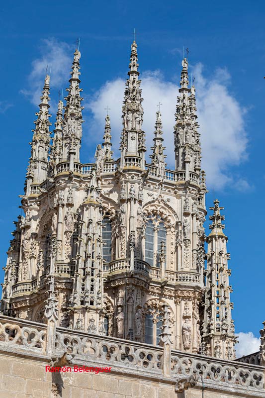 Sobre las puertas laterales del primer cuerpo se alzan dos torres casi gemelas del siglo XIII y de tres cuerpos, con pilastras decoradas con pináculos y estatuas en sus ángulos, y con decorados vanos ojivales en cada cara de cada cuerpo: uno abocinado con mainel y tracería de óculo, tapado con vidrieras, en el primero; dos geminados sin mainel y sin tracería, en el segundo; y otros dos geminados con mainel y tracería, en el tercero. Sobre estas torres, a mediados del siglo XV, Juan de Colonia elevó sendas agujas o chapiteles piramidales de base octogonal y de finos calados que configuraron definitivamente la silueta de la seo burgalesa. Su progenie suevoalemana coincide con el proyecto de la catedral de Colonia, que pudo conocer el maestro Juan, si bien las agujas de la ciudad alemana no se realizaron hasta el siglo XIX. Los chapiteles burgaleses fueron levantados con las aportaciones económicas del obispo Alonso de Cartagena y de su sucesor en la sede, Luis de Acuña, cuyos blasones, junto con los de la monarquía castellano-leonesa, aparecen en los antepechos que conectan con las cúspides de las torres. En estos antepechos el maestro Juan dispuso también la leyenda pax vobis y la escultura de Cristo mostrando las huellas de su Pasión, en uno, y la leyenda ecce Agnus Dei (he aquí el Cordero de Dios) y una escultura de San Juan Bautista, en el otro. Jalonan el conjunto de la fachada dos torrecillas poligonales, decoradas con arquillos lobulados, con pináculos y con estatuas y rematadas en agujas piramidales que ascienden hasta el arranque de las agujas de las torres; en su interior albergan sendas escaleras de caracol que ascienden al triforio y a las bóvedas de la catedral