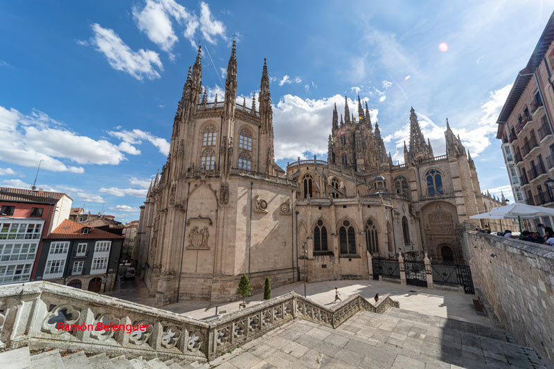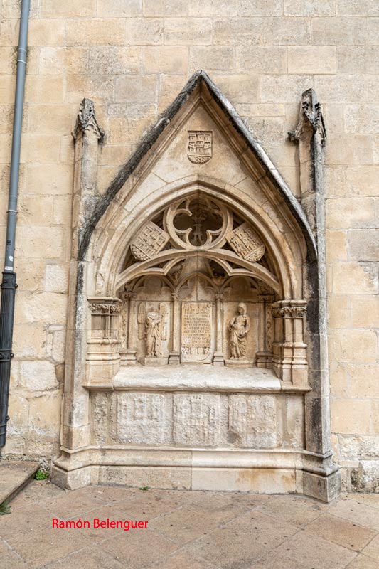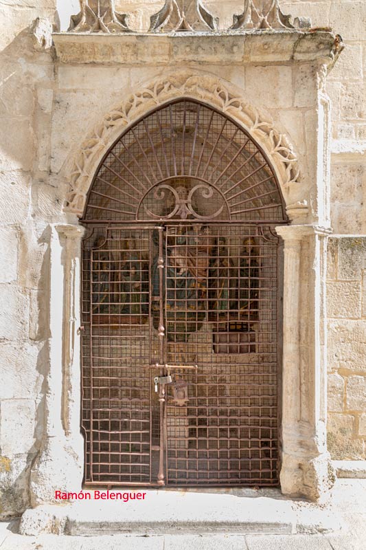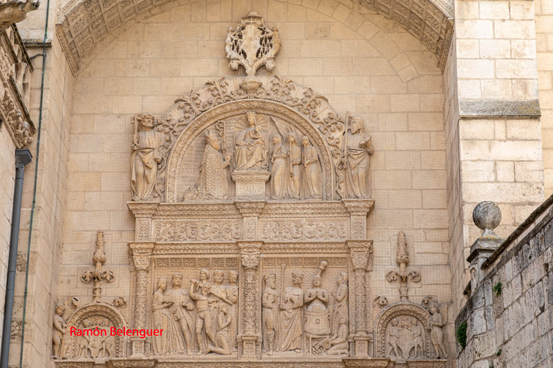 PUERTA DE LA CORONERÍA (S. XIII).En el hastial del brazo norte del crucero, a la altura de la calle Fernán González pero en un nivel varios metros más elevado que el del suelo del templo, se abre la portada de la Coronería, o Puerta de los Apóstoles, que desde el interior de la catedral se comunica con la nave mediante la Escalera Dorada de Diego de Siloé. Dada la inclinación del terreno, esta calle se encuentra sobreelevada respecto al nivel del suelo del templo, por lo que la puerta se encuentra abierta en alto y se ha de comunicar con el interior mediante la famosa Escalera Dorada, obra de Diego de Siloé.