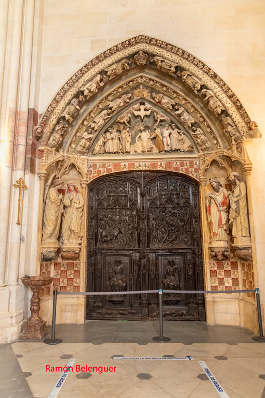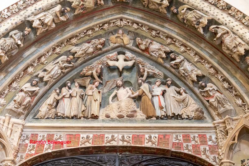 Históricamente esta puerta se concluyó hacia 1270. La estructura y las imágenes reflejan el estilo del segundo periodo del gótico radiante de París y Reims y es atribuida al Maestro Enrique, constructor del claustro. La escultura es comparable a la de la portada del Sarmental. Las puertas son realizadas hacia 1495 por Gil de Siloé, que recibe el encargo del Obispo D. Luis de Acuña. A pesar de los 225 años de separación entre portada y puertas, el programa iconográfico es complementario. En la jamba derecha de la portada vemos representados al rey David y al profeta Isaías, que anuncian la venida de Cristo, Salvador del mundo. En la jamba de la izquierda contemplamos el anuncio del Ángel a María para que acepte ser la entrada del Salvador. En el tímpano se representa el Bautismo de Jesús, que lleva a cabo Juan el Bautista, y supone la proclamación y entrada de Jesús en su pueblo. El Padre dice: Este es mi Hijo, y desciende sobre Él el Espíritu-Santo.