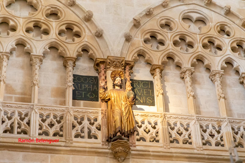 Se encuentra en la fachada principal en el interior de la puerta de Santa María a unos 15 metros de altura sobre el triforio, en lo alto del primer ventanal justo a la derecha del rosetón en la pared contigua, asoma el personaje más curioso y popular de este templo: se trata de un autómata del siglo XVIII que recibe el nombre de Papamoscas. Es un reloj con una figura articulada que, todas las horas en punto, mueve un brazo con el que da un campanazo y abre al tiempo la boca, figurando que caza moscas. Tiene una partitura en su mano derecha Es del siglo XVI y fue completada por el relojero.