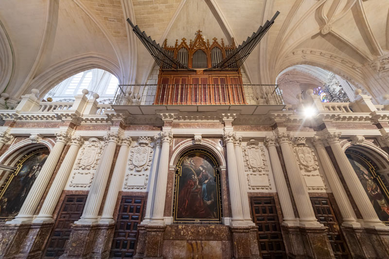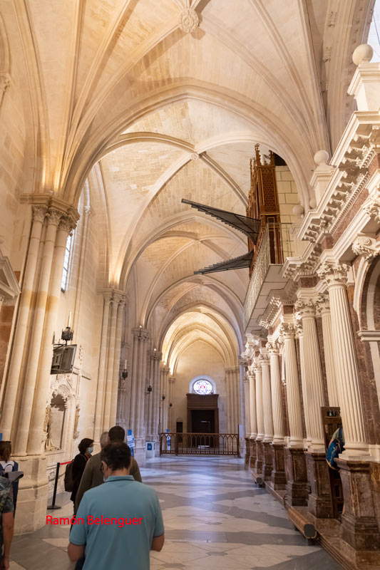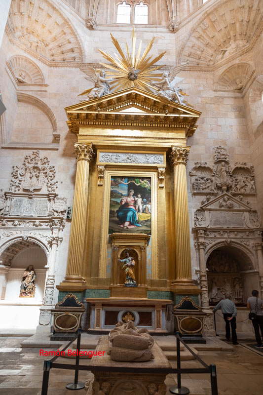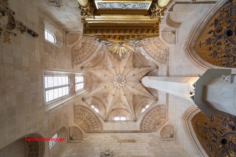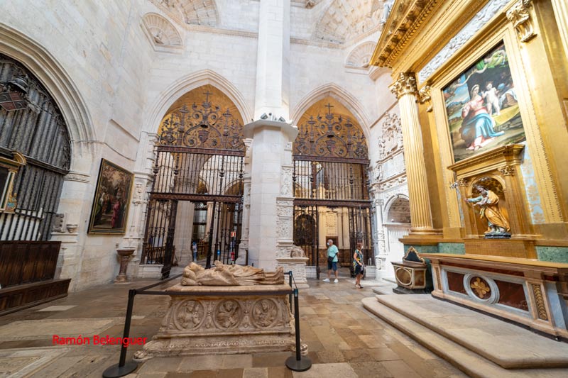 Destacamos tres elementos muy importantes. En primer lugar, la bellísima bóveda estrellada en cuyo centro se abre una rosa calada por la que penetra la luz cenital, construcción inspirada en la de la capilla de los Condestables, que luego contemplaremos.