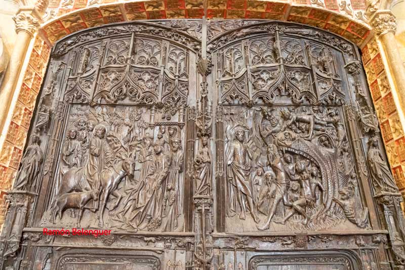 En las arquivoltas se hallan catorce estatuillas que representan patriarcas, profetas y reyes de Israel, que anuncian o hacen relación a la genealogía humana de Cristo. Las puertas completan el programa de las entradas de Jesús: En la de la izquierda se contempla la entrada de Jesús en Jerusalén, que se halla montado sobre un pollino y está rodeado de los apóstoles y otros personajes que tienden sus mantos por donde va a pasar Jesús. En la de la derecha aparece Cristo resucitado, tendiendo la mano a Adán y Eva, que salen del Limbo, representado este en un gran dragón que arroja por su boca a los justos que vivieron antes de Cristo. En el mainel simulado se halla la imagen de la Virgen con el Niño y otros santos, evangelistas, apóstoles e intercesores; finalmente en la parte baja se abren dos portezuelas con los altorrelieves de San Pedro y San Pablo y la Virgen; son las entradas para recuperar el Paraíso, la Jerusalén celeste.