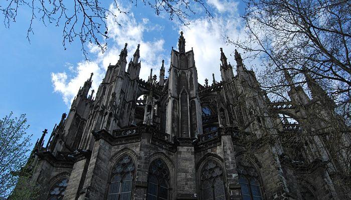 La catedral de Colonia tiene dos naves a ambos lados que ayudan a sostener una de las bóvedas góticas más altas del mundo. Esta bóveda es casi tan alta como la de la Catedral de Beauvais, que de hecho se derrumbó. Externamente la salida de la bóveda es soportada por los contrafuertes a la manera francesa.