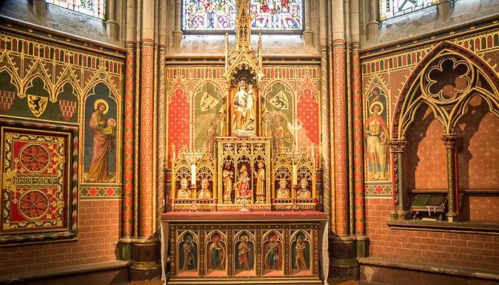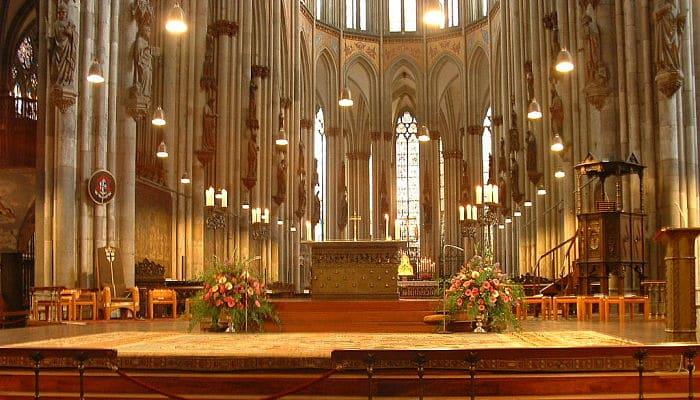 Hay un moderno altar de bronce de Elmar Hillebrand (1960). Detrás de esto se encuentra el alto coro con el coro ambulatorio. Los puestos del coro tienen 104 asientos que los hacen el más grande de Alemania. Las pinturas del presbiterio fueron añadidas alrededor de 1340. Encima de éstas, podrás ver las esculturas más antiguas del pilar del santuario de Jesús, María y los 12 Apóstoles. Además de la Adoración de los Magos, todo el círculo de ventanas de cristal en el piso superior de la nave central representa otras 48 figuras reales.