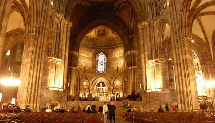 El interior de la Catedral de Estrasburgo es majestuoso, con su nave bellamente proporcionada, respetuosa del estilo gótico. A 32 metros de altura, es bastante alta. Las dimensiones reducidas del presbiterio y la longitud de 63 metros de la nave acentúan la impresión de desproporción.