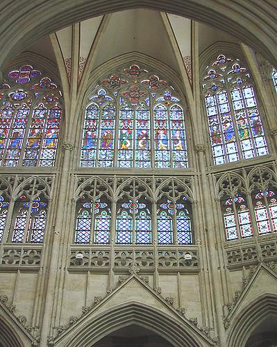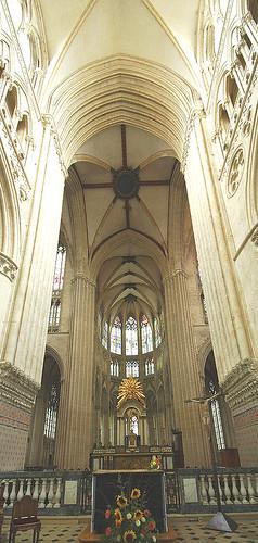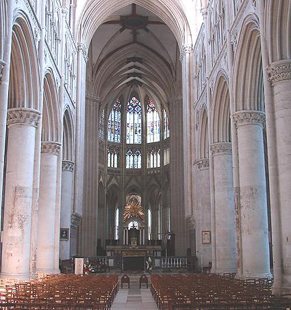 La gran nave de los siglos XIII y XIV está considerada como la más audaz del período gótico; quizás porque sus formas nos parecen imposibles. La nave llega hasta el coro y se abre como los brazos hacia los cruceros considerados como los más perfectos y puros del gótico normando del XIII siglo. Es una decoración que baja y sube, dentro de la simpleza y que juega con la luz de sus vidrieras a la noche y al dia y es precisamente el coro el primero que se inunda de la luz del día cuando el sol saluda desde lo alto. La característica flor del arte normando se coloca al borde de las grandes columnas de tal modo que parece oler al peregrino, una bella estampa que podemos fácilmente imaginar.