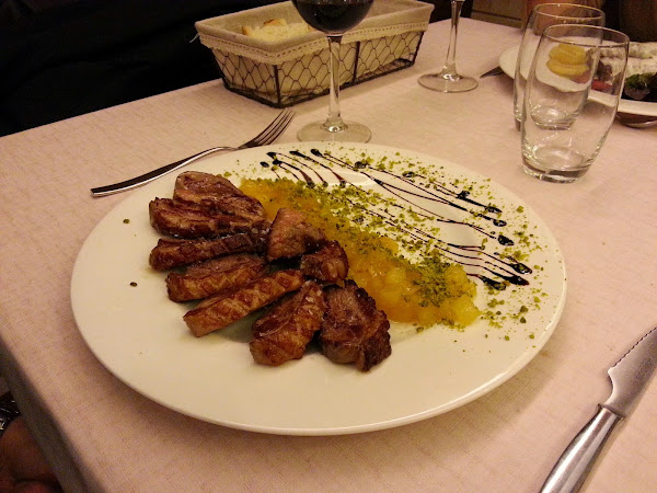 Mi novia pidió magret de pato con tartar de manzana y pistacho que estaba muy bueno, mis amigos pidieron solomillo de ternera lardeado con beicon y salsa de queso, patatas y pimientos que tenia muy buena pinta y para mi solomillo de ternera lardeado con beicon al foie, buenísimo, buena tajada y muy buen sabor.