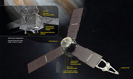 La sonda Juno orbitará a unos 5.000 kilómetros de la superficie de Júpiter, diez veces más cerca que cualquiera de las nueve sondas que lo visitaron antes, y funcionará alimentado por paneles solares. Esta tecnología es una rareza en misiones que van más allá del cinturón de asteroides. Hasta ahora, todos los artefactos que han visitado el planeta gigante lo hicieron con plutonio-238, pero la escasez de ese elemento radiactivo, las preocupaciones de seguridad y los avances tecnológicos hicieron que la NASA se decidiese por la energía solar.