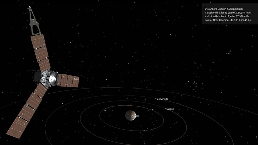 A ese mundo llegará esta noche [madrugada española] Juno, una nave espacial que lanzó la NASA hace cinco años. Ahora le quedan por delante 20 meses de trabajo en condiciones extremas. Colocado en una órbita polar, estará expuesta a los cinturones de radiación de la magnetosfera jupiterina en la que las partículas se aceleran a velocidades extremas convirtiéndose en una amenaza para todo lo que se cruza en su camino. Para que sus instrumentos de observación no queden abrasados por ese bombardeo, están protegidos por una caja de titanio.