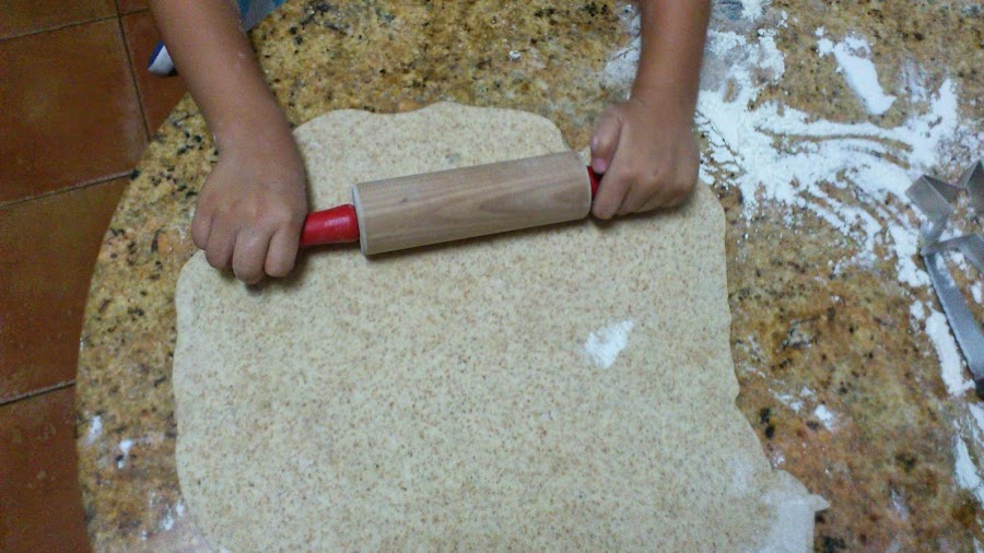 En primer lugar espolvoreamos la mesa con harina, ponemos la masa y la estiramos con un rodillo. Como yo tengo un mini Chef pues compramos un rodillo a su tamaño en Ikea, y la verdad que da mucho juego, ya que a los niños le parece muy divertido jugar con la masa.