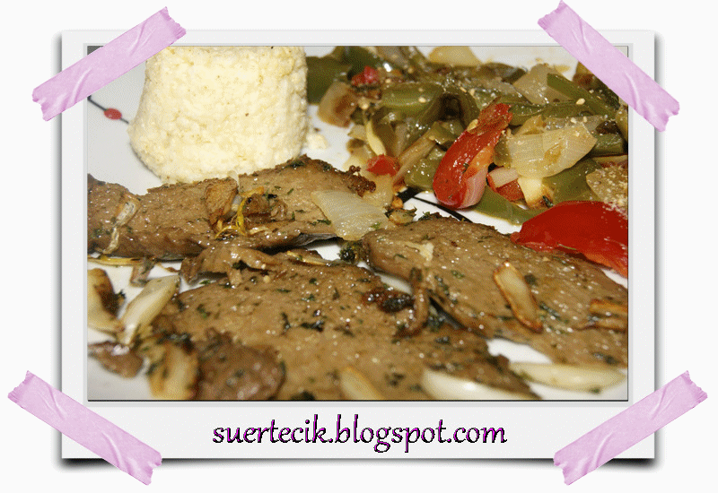 Con el aceite caliente en la sartén he refrito unas láminas de ajos y antes de que se terminaran de freir he echado los filetes de Seitán y perejil por encima, los he dejado hasta que han estado un poquito dorados.
