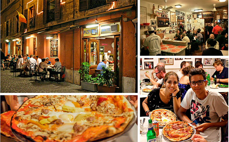 La mejor pizzería de Roma tanto para italianos como para turistas es Da Baffetto: o al menos la más popular. Céntrica, auténtica, pizzas al horno de leña y barata. Para poder juzgarla pizza primero hay que saber qué es un pizzaiolo. Son los grandes chefs y artistas de la pizza, típicos señores gordos con gorro y delantal blanco, bigote y una pala de madera. Así es el señor que regenta esta pizzería y es que baffeto en italiano significa bigote. Además las pizzas son de masa finísima y crujiente mmm rico rico! Imagina cenar una noche por Roma, callejuelas adoquinadas en pleno centro, terracitas típicas y una pizzería al forno di legna de lo más auténtica y todo esto sin pagar un precio elevado.