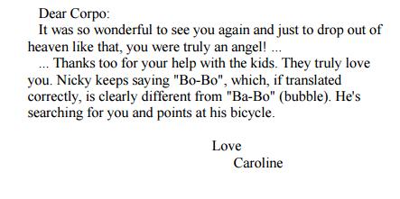 La idea de Tyrone funcionó a la perfección. Fui un buen regalo de Navidad para Caroline y para los niños. Diez días después, temprano por la mañana, me fui. Les escribí una nota de despedida a cada una de las niñas.