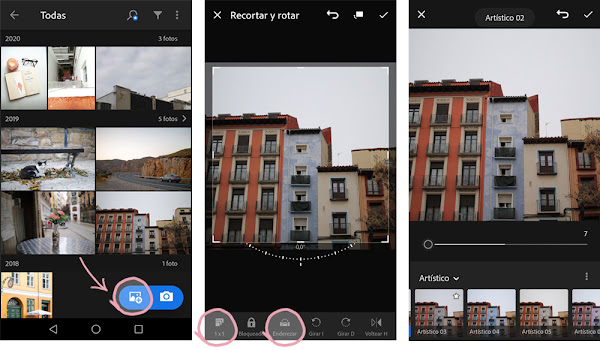 Importar la fotografía a Lightroom. Me gusta esta app porque crea una especie de álbum con todas las fotos que vas añadiendo, pudiendo volver a ellas en cualquier momento (incluso aunque las borres del teléfono).