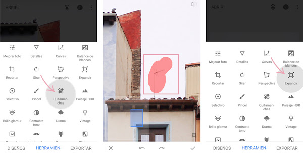 Quitamanchas: El nombre de esta herramienta habla por sí solo. Pintando con el dedo permite borrar objetos no deseados en la imagen, por ejemplo la antena del edificio. No es una herramienta muy precisa... pero hace el apaño. Cuanto más lisos y limpios estén los alrededores del objeto que vayamos a borrar, más fácil es que quede bien.