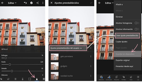 Exportar fotografía: Tanto para guardar la foto editada como para crear un ajuste preestablecido, habrá que pulsar los tres puntitos que se ven en la esquina superior derecha de la pantalla. Lo mejor es guardarla en la mayor calidad disponible.