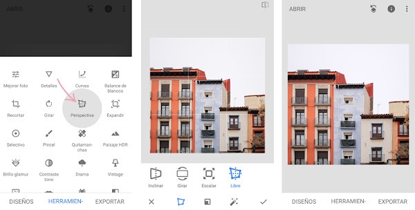 Con Snapseed también podemos editar luces y colores (en "mejorar foto"). No obstante, como esto ya lo he hecho con Lightroom no voy a repetir la edición. Me voy a centrar en otras tres herramientas: