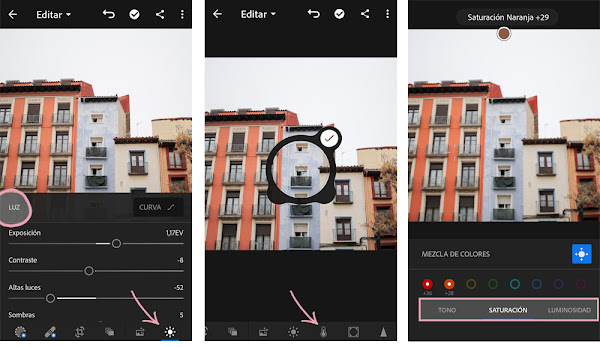 Ajustes de color - Balance de blancos: El icono del cuentagotas permite ajustar el balance de blancos. Yo siempre subo un pelín la intensidad para que brillen más los colores y ajusto la temperatura tirando más a cálida que a fría.