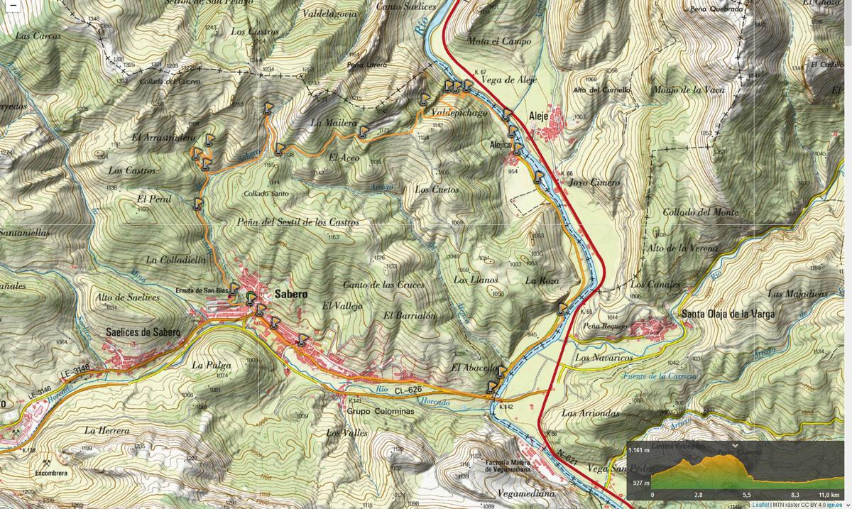 Desde Alejico el regreso hacia Sabero, hasta el que todavía quedan 4 km, se hace primero por la carreterilla que corre junto a la vega del Esla y después, al alcanzar la CL-626, por la acera que corre por uno de sus arcenes.