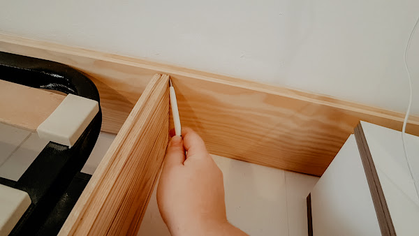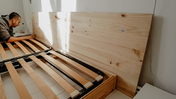 Cuando los somiers ya se aguantaban en sus patas de madera, empezamos a montar la estructura de fuera. Lo primero que hicimos fue colocar un listón en el cabezal y otro en el lateral, y marcar allí donde se cruzaban para más tarde cortarlo por esa medida y que nos encajara a la perfección.
