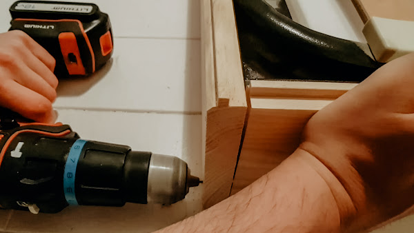 Para unir el cabezal con la cama, utilizamos seis tornillos. Agujereamos las dos maderas juntas, y lo fijamos con tornillos y arandelas.