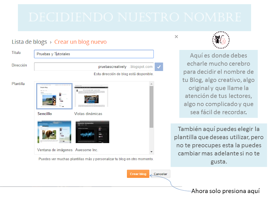 Otro punto muy importante es, que tienes que crear la dirección http://, por ejemplo en este de Pruebas y Tutoriales Quería ponerle pruebasytutoriales@blogspot.com pero ese ya estaba tomado, Así que me decidí por pruebascreatively@blogspot.com y este si estaba libre.