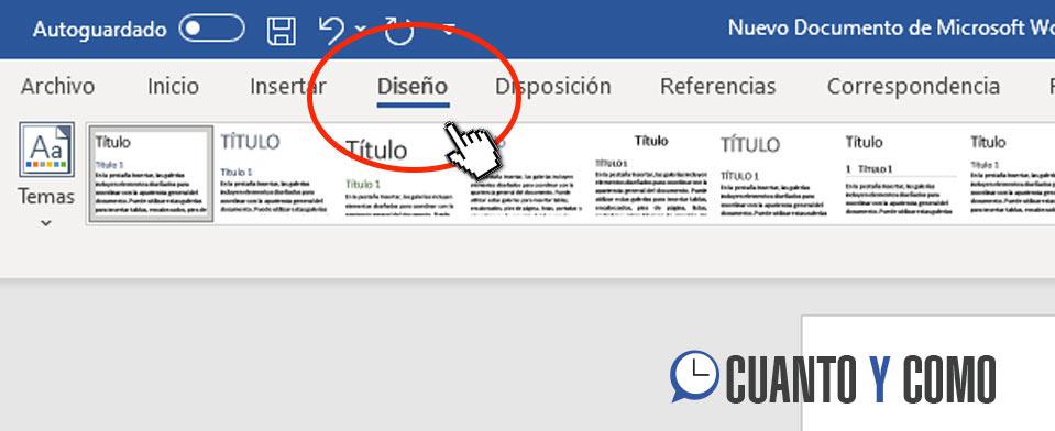 En la cinta de opciones en la parte superior de la pantalla, haz clic en la pestaña Diseño (o Diseño de página en versiones anteriores de Word).