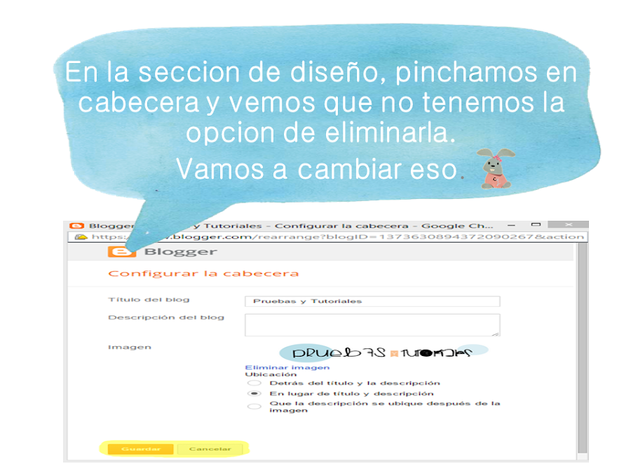 Hoy quiero retomar los tutoriales que ya tenia abandonado por algún tiempo, y es que con los cambios de imagen del Blog y mi nuevo colega que esta chulisimo, me apetecía quitar el Titulo del Blog, pero para sorpresa (y no grata) Blogger no te da la opción de eliminar el Titulo, pero para todo hay truco y no hay que ser maga para hacerlo, solo mover por aquí y por allí.