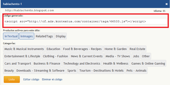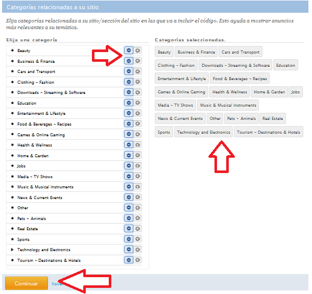 Elija categorías relacionadas a su sitio/sección del sitio en las que va a incluir el código. Esto ayuda a mostrar anuncios más relevantes a su temática.