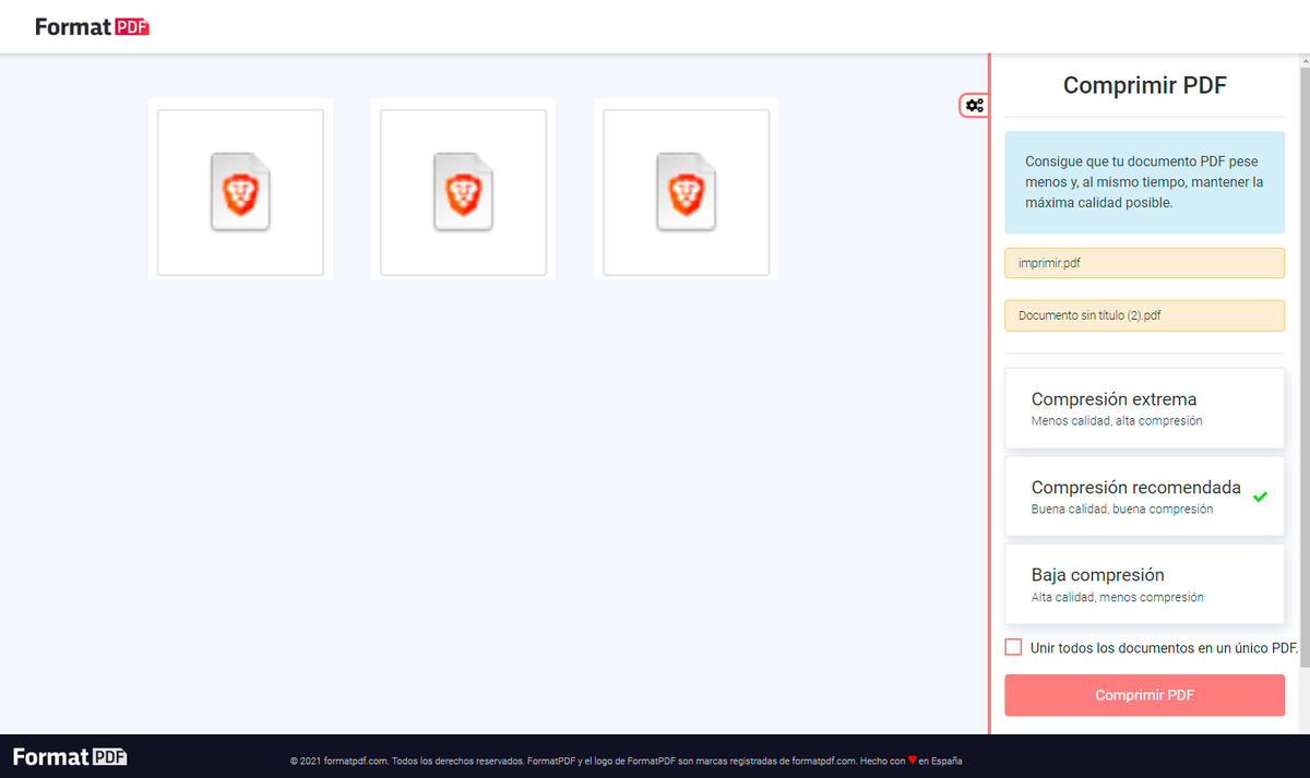 FormatPDF es una herramienta online gratuita que te permite comprimir tus archivos PDF sin alterarlo de ningún modo. Tan sólo a un par de clics de distancia, puedes tener tu documento PDF más pequeño, invirtiendo sólo un momento.