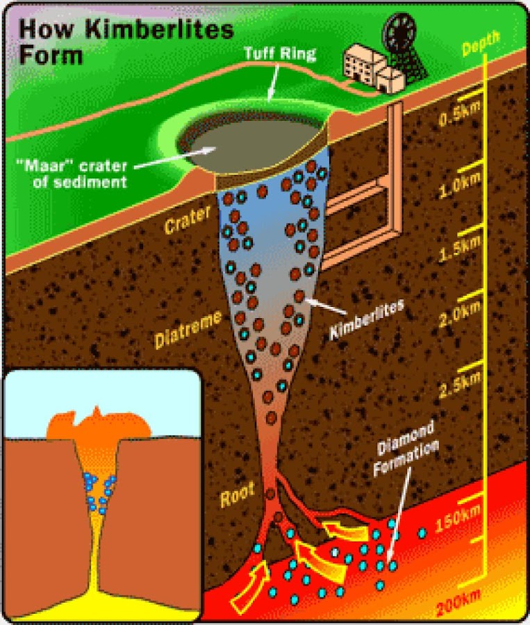 Los diamantes surgieron de las profundidades de la Tierra a través de las chimeneas de kimberlita, (un tipo de roca ígnea volcánica) que forman las raíces de ciertos volcanes súper potentes que llegan hasta 3 veces más profundo que grandes volcanes como el Monte Santa Helena. Cuando esos volcanes hicieron erupción millones de años atrás, llevaron consigo a la superficie las kimberlitas con diamantes.