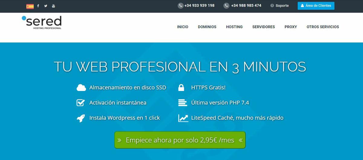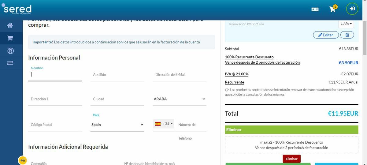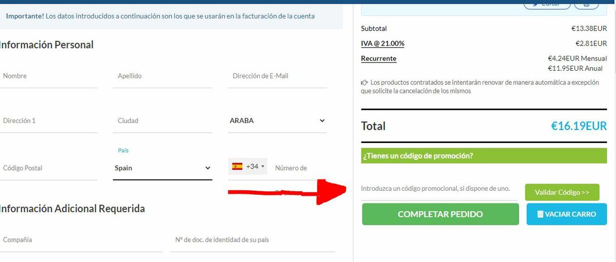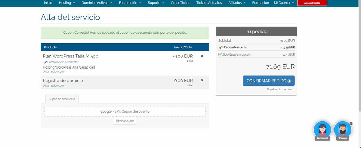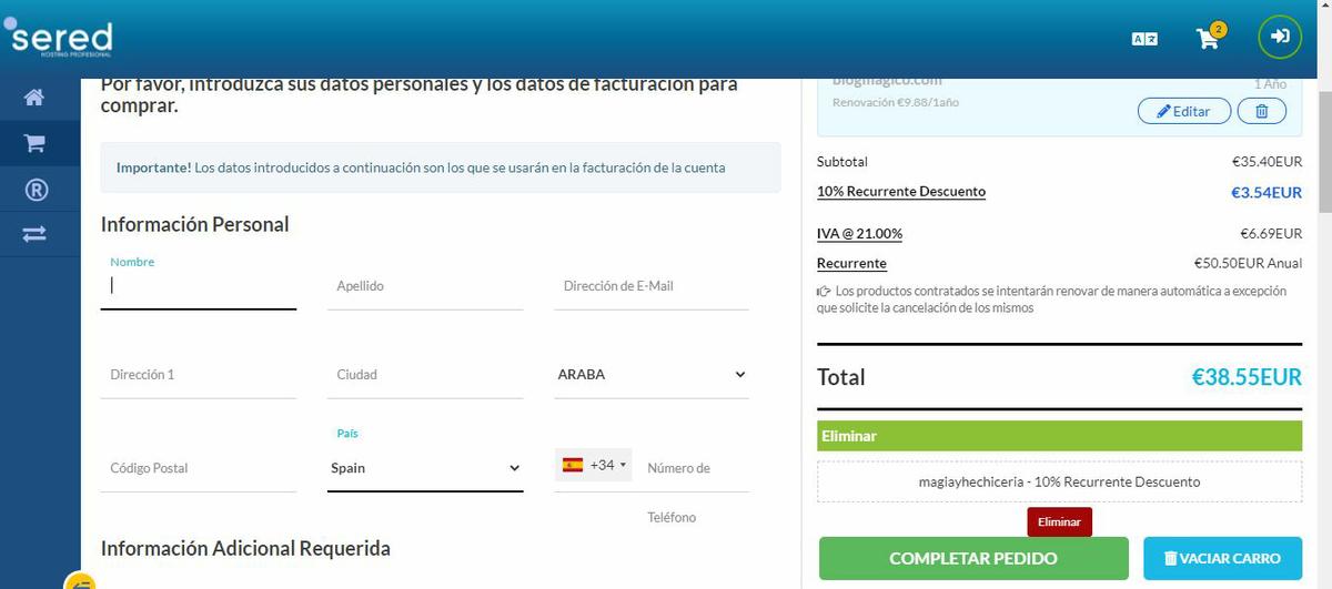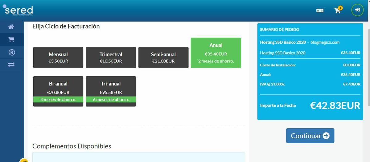 Una vez elijas un dominio que esté disponible le das a continuar y a pagar. Como puedes ver puse en codigo de descuento el código “google” el cual te da un 25% de descuento. Sin ese código el Hosting te costaría cerca de 100 euros.Sered