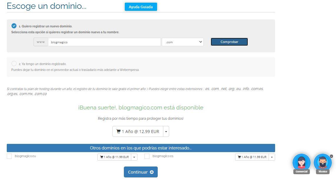 Eliges un dominio. Un dominio es la palabra identificativa que tiene un blog o una web. Ejemplo: Magiayhechiceria.com es nuestro dominio.Consejo: No elijas un dominio con marca comercial, “Harry Potter” es marca comercial. Tiene que ser algo tuyo, en este ejemplo verás que puse “blogmagico.com”