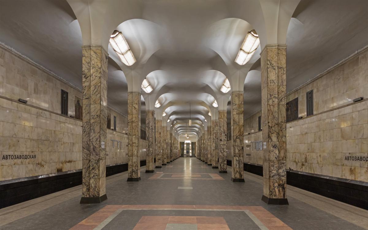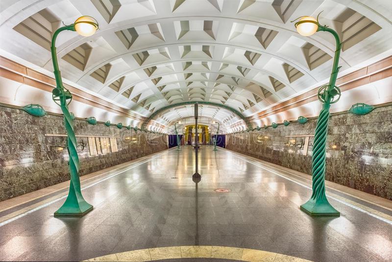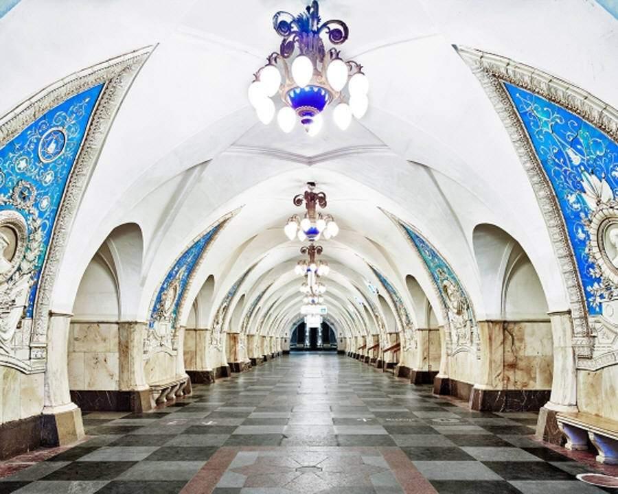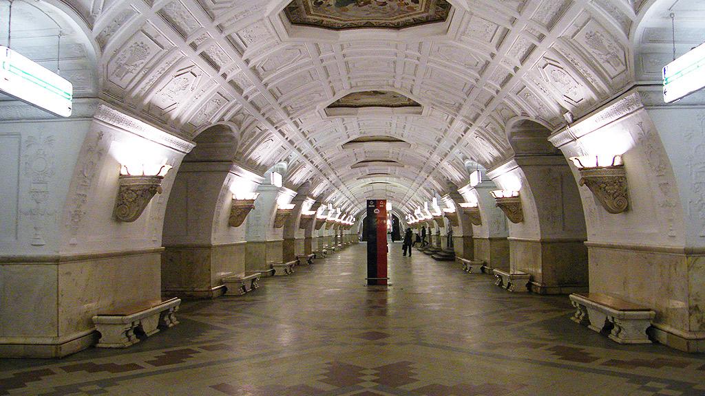 Esta estación de metro es muy elegante, por sus colores blancos, sus arcos y su techo abovedado, contiene unas lámparas incrustadas y 34 mosaicos en el techo con elementos soviéticos.
