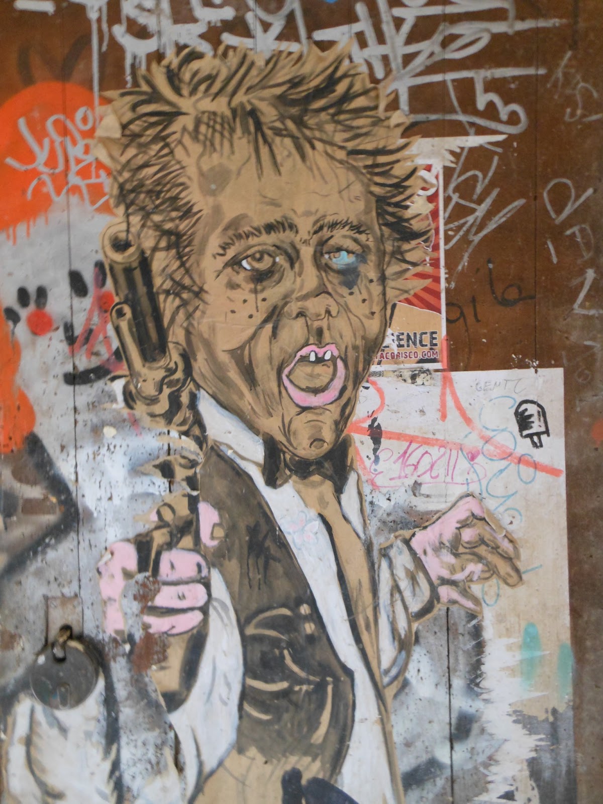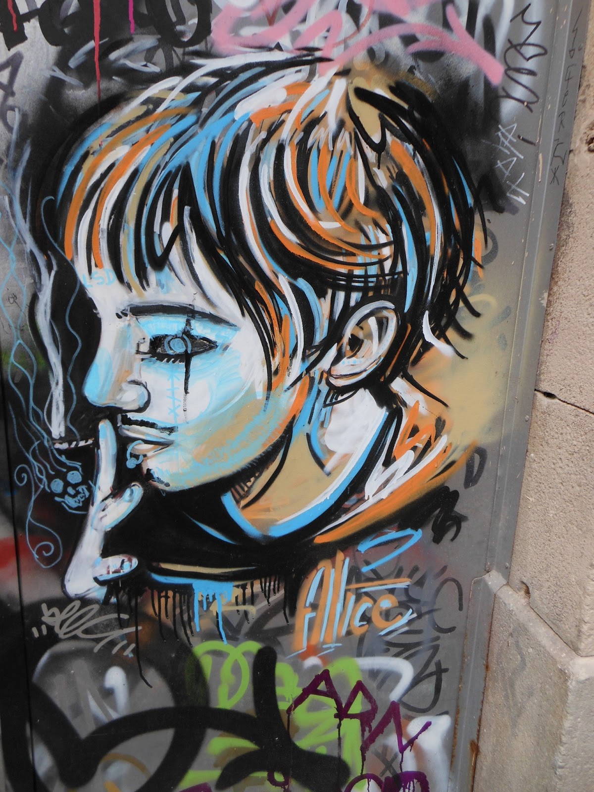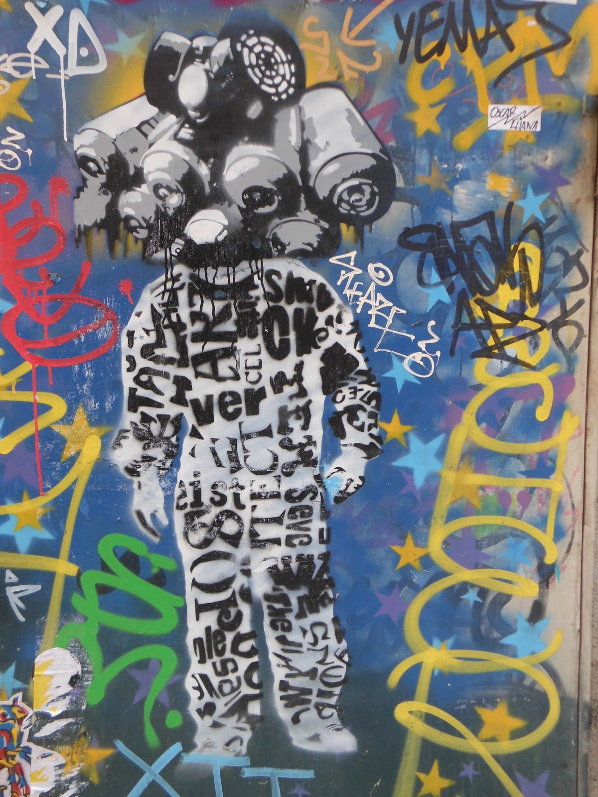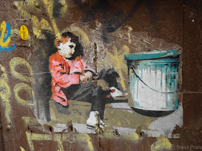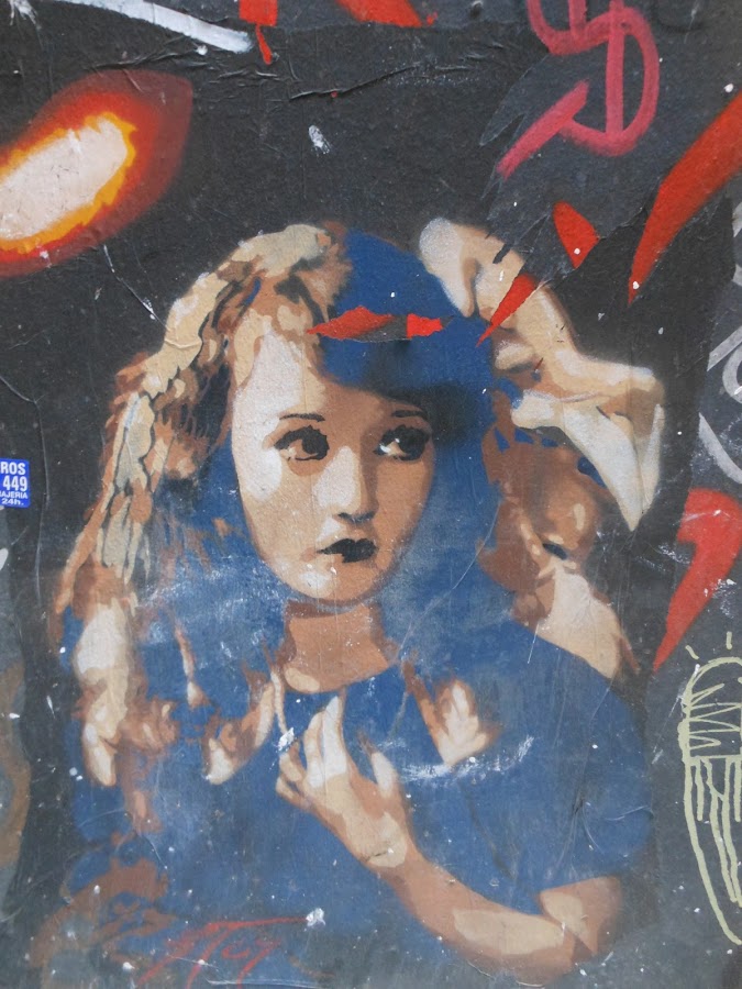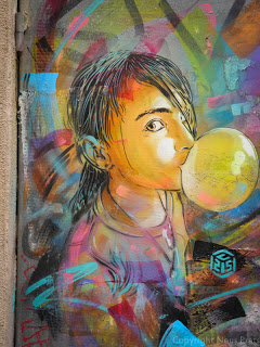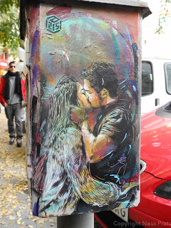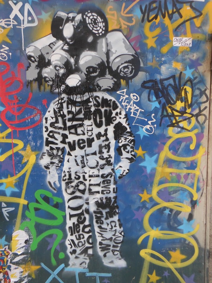 Tenemos las paredes,vagones de metro,de tren, todas pintarrajeadas, hasta sitios inverosimiles, pero entre tanto gamberrismo y embrutecimiento, se hallan verdaderas obras de Street Art, claro que son efímeras, porque quien las aprecia y quiere llevarselas, arrancan con lo que pueden, y quien no, las colorea, destroza o las tapa.