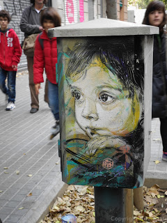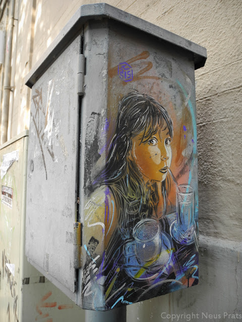 Si os fijais casi todas está la firma del artista C215 metida en un cubo, él es de los que más tiempo permanecen en Barcelona, la niña que aparece es su hija y la muchacha parece ser que es Alice, su pareja, que como vereis lo pinta a él