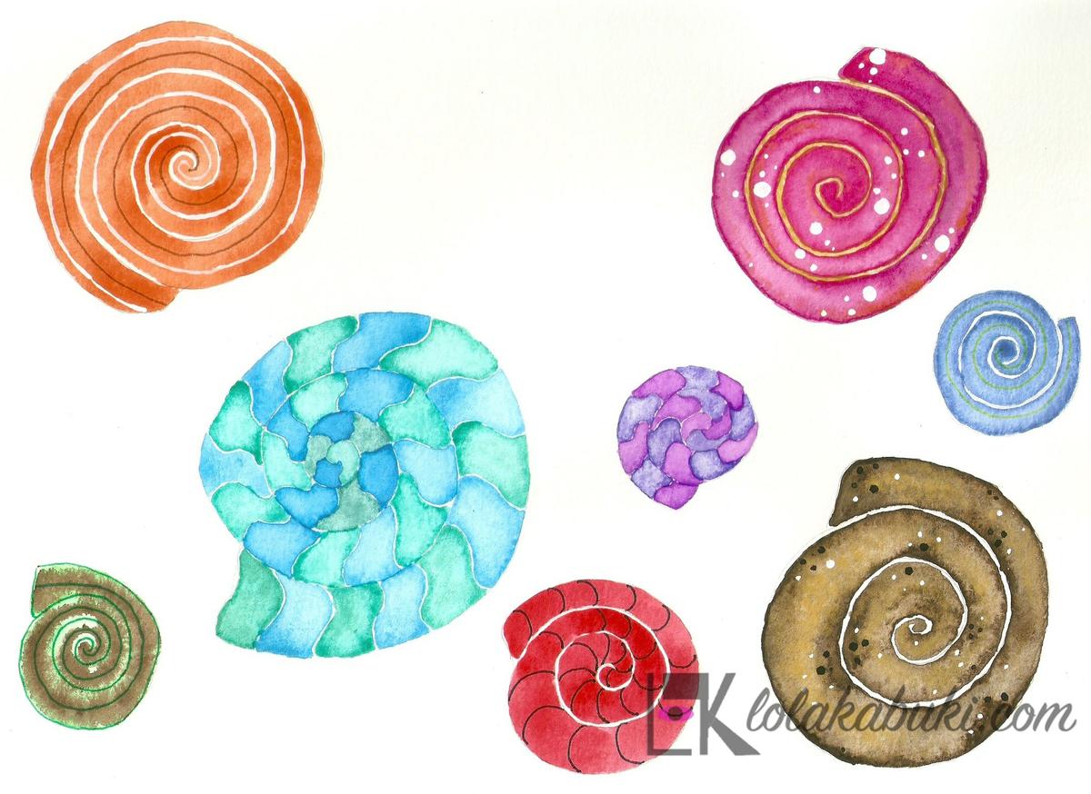 Conchas de colores realizadas en acuarela y tinta sobre papel. Dos pinturas diferentes, una de conchas de erizos de mar y otra de caracoles