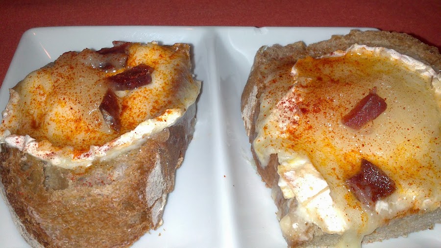 Después fuimos hasta "La charra" (Rúa Laxe,5) y probamos su "Charrulo", dos tostas con rulo de cabra, mermelada de cebolla, jamón serrano y pimentón. Nos gustó mucho el sabor y el contraste de dulce, salado y picante.