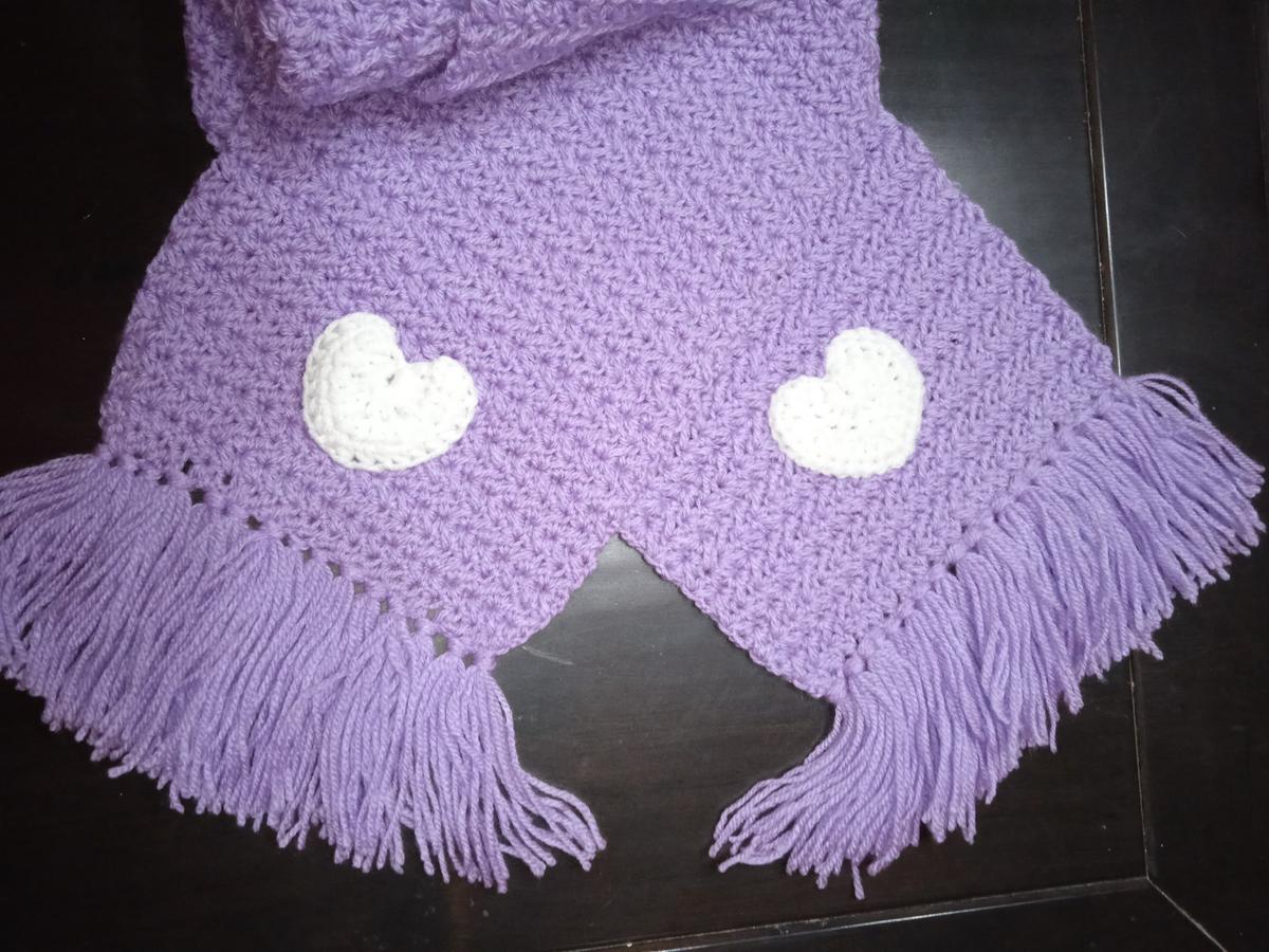 La bufanda es larguita para que pueda abrigarse bien, con detalle de corazones de color blanco igual que el bolso, uno en cada extremo. Se podía hacer con o sin flecos pero ella eligió con flecos.