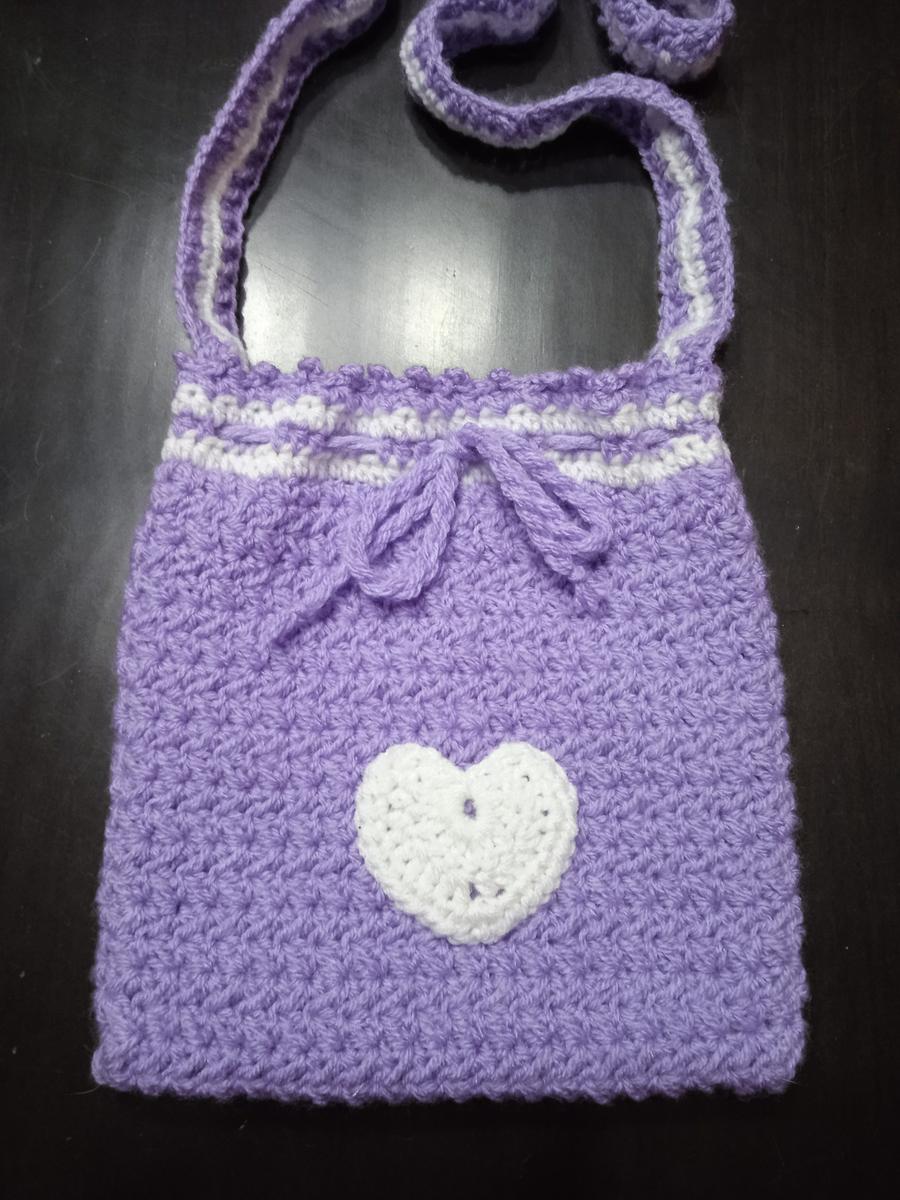 El bolso es de tamaño mediano, con detalle de corazón de color blanco, cierre de cordón de la misma lana, forrado y con asa regulable para poder ir adaptándolo a su altura con forme vaya creciendo.