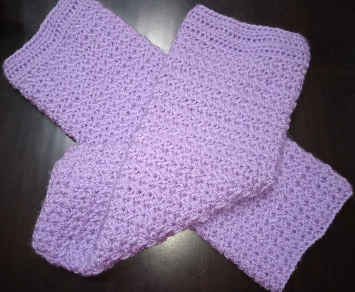 Por último, un par de calentadores (los terceros que hago este año que parece que vuelven a estar de moda), en color lila a conjunto con todo lo demás solo que éstos no llevan corazón. Rectos con un pequeño puño en la parte alta para que agarre en la pantorrilla.