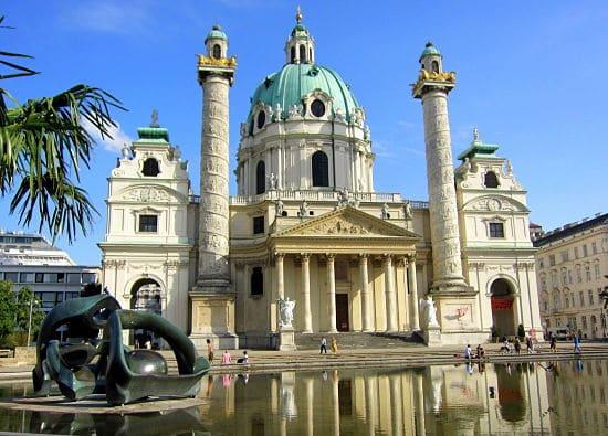 Dedicado a San Carlos Borromeo, un santo invocado durante épocas de peste, Karlskirche fue construido en 1737. Sigue siendo el más importante edificio religioso barroco de Viena. Este vasto edificio está coronado por una magnífica cúpula de 72 metros de altura. Y es famoso por sus pilares triunfales de 33 metros basados en la Columna de Trajano en Roma. Tienen bandas en espiral que representan escenas de la vida de San Carlos. En el interior se destacan los fabulosos frescos de Santa Cecilia.