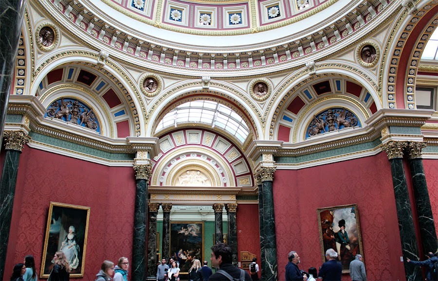 Los museos en Londres son gratis, por eso verás muchas huchas para donativos en las entradas y además los planos suelen costar dinero así que prescindimos de ellos y nos lanzamos a la aventura recorriendo las salas. La National Gallery es uno de los museos mas importantes de Londres y sus colecciones son únicamente de pintura. Sin control del tiempo veíamos una sala tras otra dedicando lo justo para que nos diese tiempo a verlo todo. Qué rabia me da no poder ver las cosas a mi lentísimo ritmo! Tampoco sabíamos en general qué artistas nos encontraríamos allí. Yo iba en busca de La Venus del espejo de Velázquez, una de sus pocas obras que no se encuentran en el Prado, y La Virgen de las rocas de Leonardo da Vinci. Todo lo demás fue una gran sorpresa. Pinturas de Rembrandt, Tiziano, Monet... y los famosos Girasoles de Van Gogh. Pinturas desde el siglo XII hasta el 1900. Para que no os pase como a mi os dejaré una lista de lo que no os podéis perder de la National Gallery.