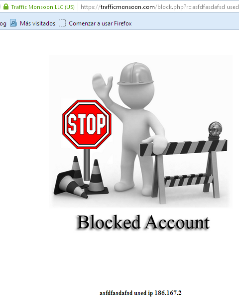 Cuando te aparece esta página en Trafficmonsoon que dice: Blocked Account, no te asustes, normalmente la bloquean cuando no hay anuncios a mostrarte, tienes que conocer bien el horario al día cuando está habilitada con anuncios, te recomiendo entrar diariamente y ir conociendo su horario de anuncios visibles.