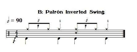 .., y así llegamos a la otra cuestión. ¿Cómo adaptar patrones donde el pulso es mas tipo Disco Dance, con los contra tiempos en el Charles (HH) o del tipo Funk Pop o Funk Dance con riffs y fraseos sincopados?.. Bien, pues así lo he desarrollado yo.. El resultado al completo es la combinación de cuatro patrones: El de Pop/Rock, el de Swing, el de Reggae y un cuarto, algo menos común, que es el Inverted Swing.