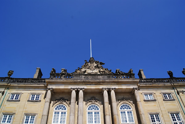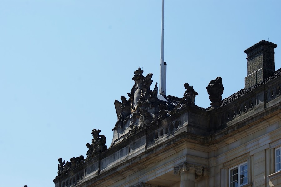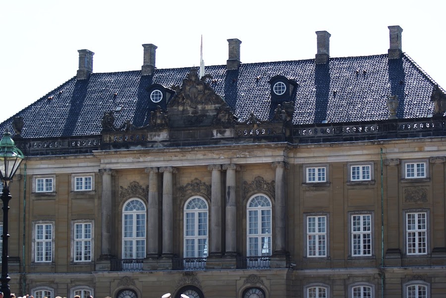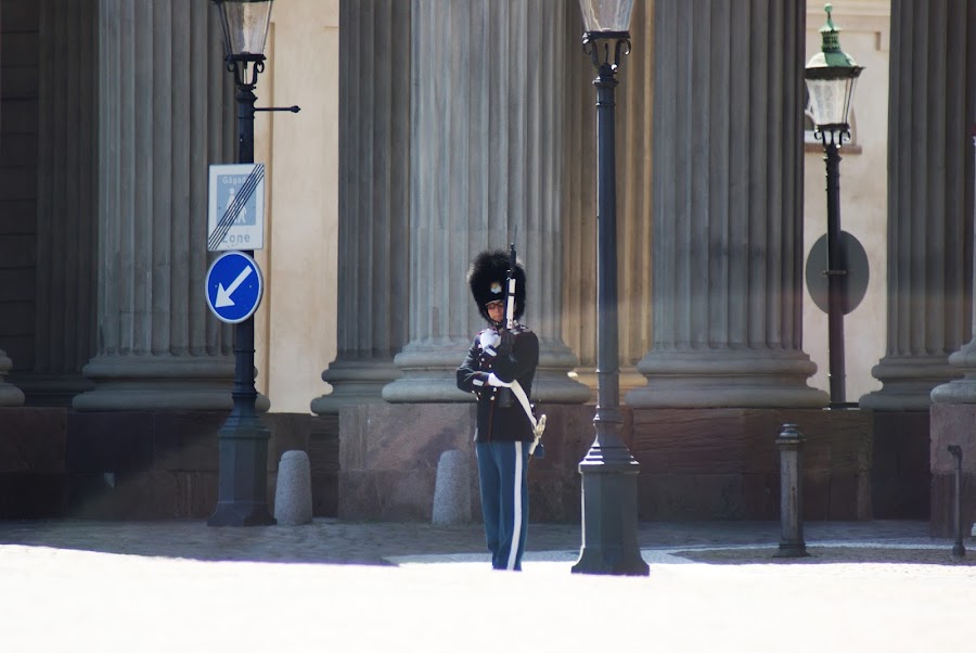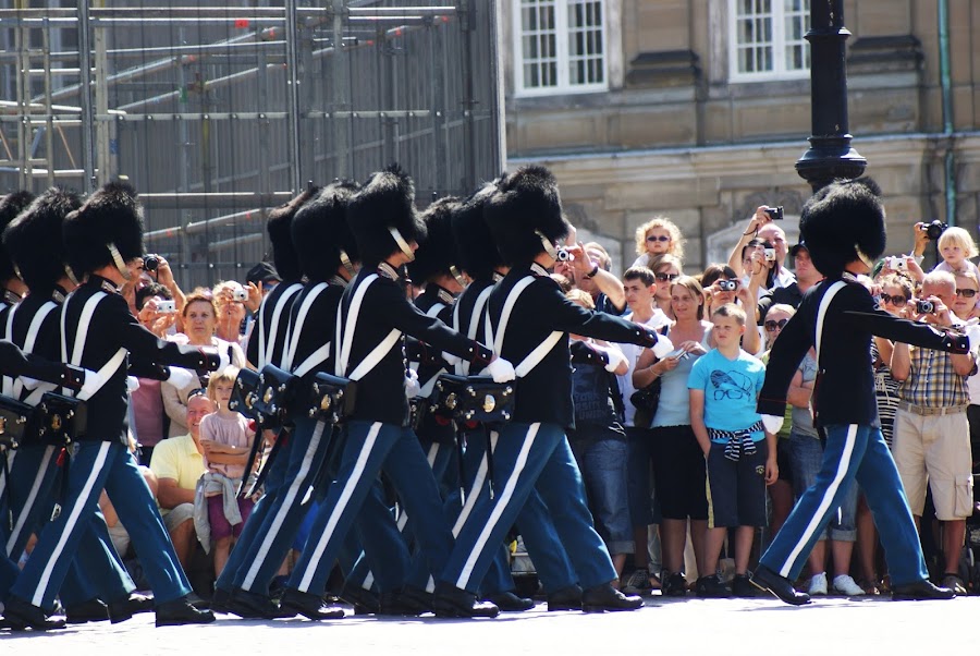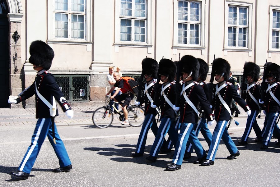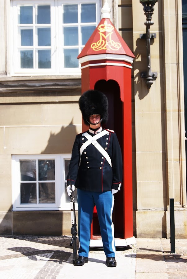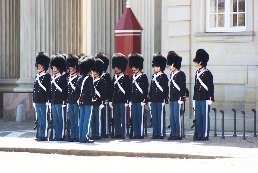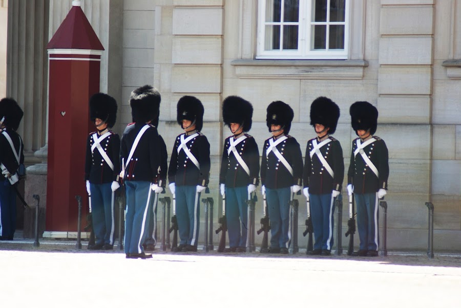 La guardia real danesa viste con casacas azules, aunque estas se tornan rojas cuando la ceremonia es de gala. Luego comprobaréis que los soldados vestidos de rojo son uno de los símbolos de la ciudad gracias al cuento del Soldadito de Plomo de Hans Christian Andersen.