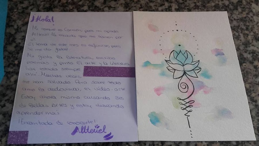 en el cual nos intercambiamos cartas por correo ordinario con creaciones hechas a mano como dibujos, poesías, juegos, marcapáginas, tarjetas, pinturas, fotografías... o la expresión artística que mejor se le dé a cada uno.