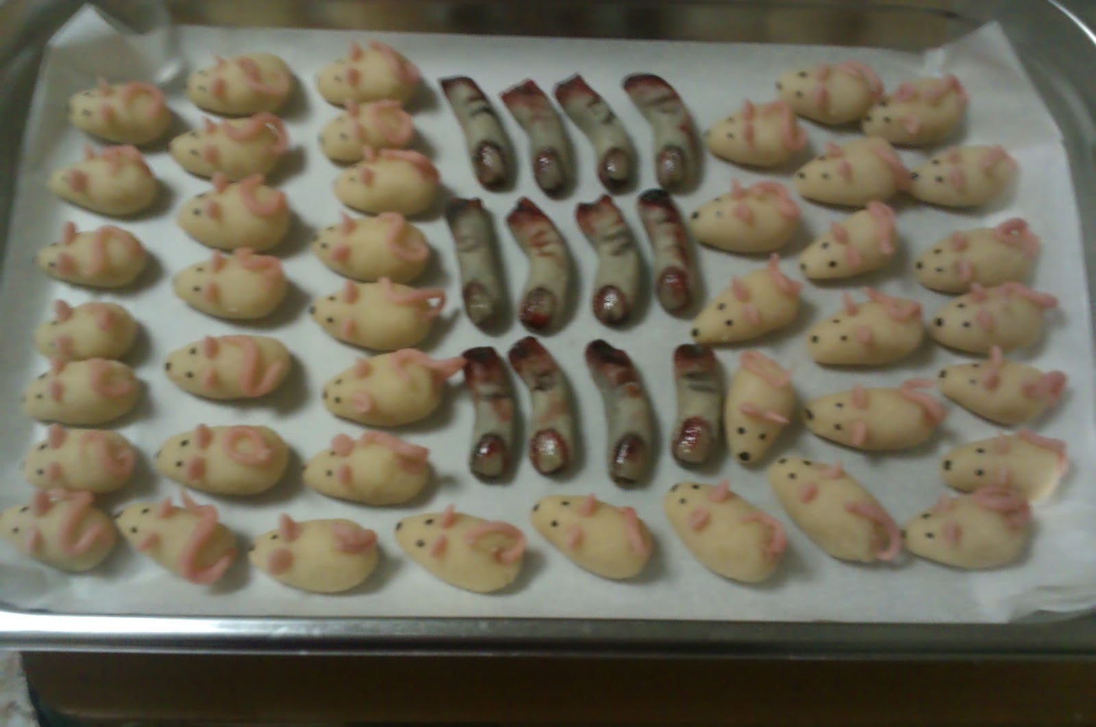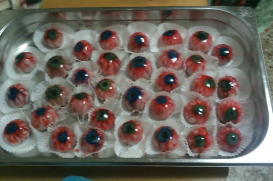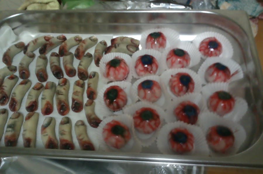 los ojos son de trufas , cubiertas con fondan de nuves , pintados y con una mano de brillo para tartas , los dedos y los ratones son de mazapan , los dedos , estan pintados tambien con pinturas comestibles