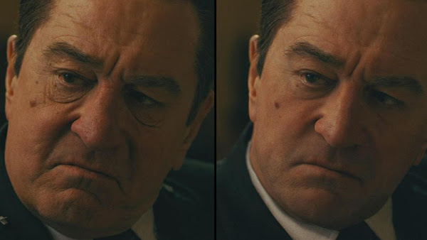 Debo mencionar que toda esta parte, se remonta a cuando Sheeran tenía treinta y cinco años, lo cual es importante en la película, no por la historia, sino por la ejecución de esta. Claramente Robert De Niro no tiene, ni por asomo, esta edad, por lo que, para poner al mismo actor en cada parte de esta historia criminal, optaron por el rejuvenecimiento digital. Admiro demasiado a cada actor involucrado en la película, pero me cuesta creer que no pudieron optar por actores jóvenes parecidos para remontarse a momentos pasados, por último como dobles de cuerpo. Los rostros se ven raros, sobre todo en De Niro, pero eso no es lo que más me incomoda, sino más bien la comunicación no verbal. Ciertamente no habría notado el rejuvenecimiento extraño, si no fuera por la escena en cuanto Sheeran, por defender la integridad de su hija, acude a la tienda en donde el dueño ha empujado a la muchacha. Es una sola toma, pero se ve tan poco enérgica que incomoda. Robert De Niro se mueve como abuelito, y la pelea, más que épica —como la de Sonny golpeando a Carlo Rizo en El Padrino—, se torna patética, debido a que sus movimientos no cuadran con su rostro y, menos, con su supuesta edad. Por otro lado, quizás la crítica es más hacia el actor, debido a que Al Pacino (interpretando a Jimmy Hoffa), quien tiene dos escenas de enfrentamientos, posee más vitalidad, aunque claro, Hoffa es siete años mayor que Sheeran.