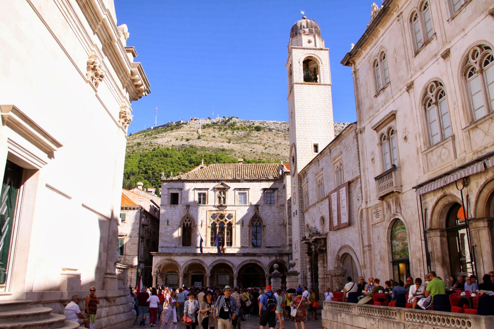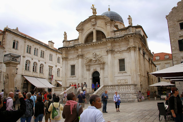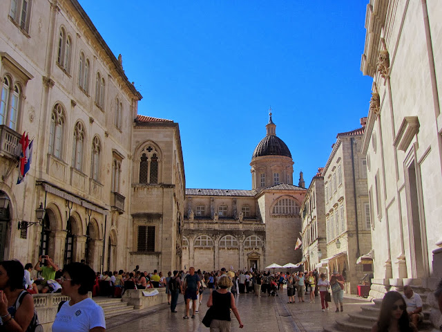 Ésta es la iglesia de San Salvador, de estilo veneciano-renacentista, que aún tiene en su fachada alguna huella de los bombardeos del 6 de diciembre de 1991. Toda la ciudad fue muy dañada, pero hoy está totalmente reconstruida. Y la calle larga que veis es la principal de la ciudad: se llama Placa o Stradun.